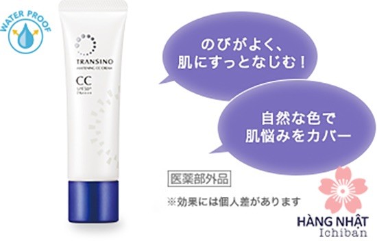 - Kem lót trang điểm Transino Whitening CC Cream giúp che khuyết điểm tốt, tạo lớp nền hoàn hảo cho da, đồng thời chứa thành phần giúp dưỡng trắng da, mờ nám và tàn nhang. Ngoài ra, sản phẩm còn có khả năng chống nắng, chống lại các tia UV, giúp bảo vệ làn da khỏi những tác nhân nguy hại từ môi trường.