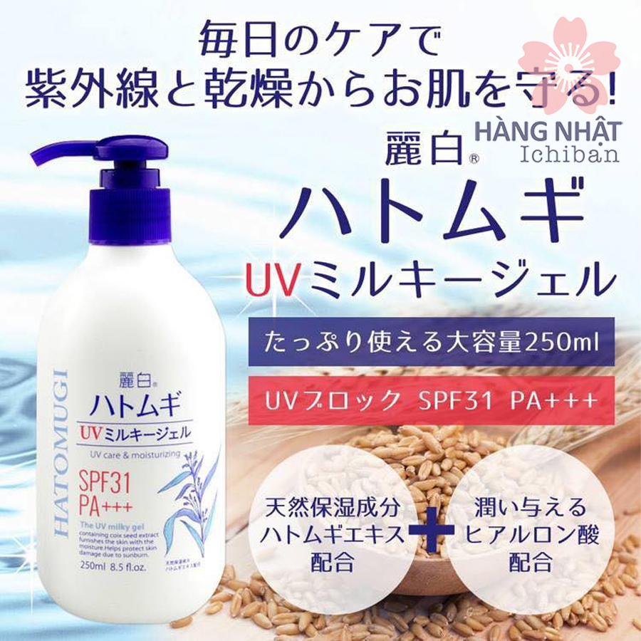 Hatomugi SPF31 PA+++ với thành phần chính là chiết xuất hạt ý dĩ mang đến 3 công dụng chỉ trong 1 sản phẩm: dưỡng ẩm, dưỡng sáng và chống nắng cho cơ thể