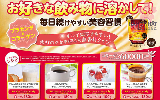 - Bột collagen nhau thai Orihiro mang đến hàm lượng collagen và nhau thai cực cao, giúp chăm sóc và nuôi dưỡng làn da từ sâu bên trong, cho da sáng mịn, hồng hào và tươi trẻ hơn.