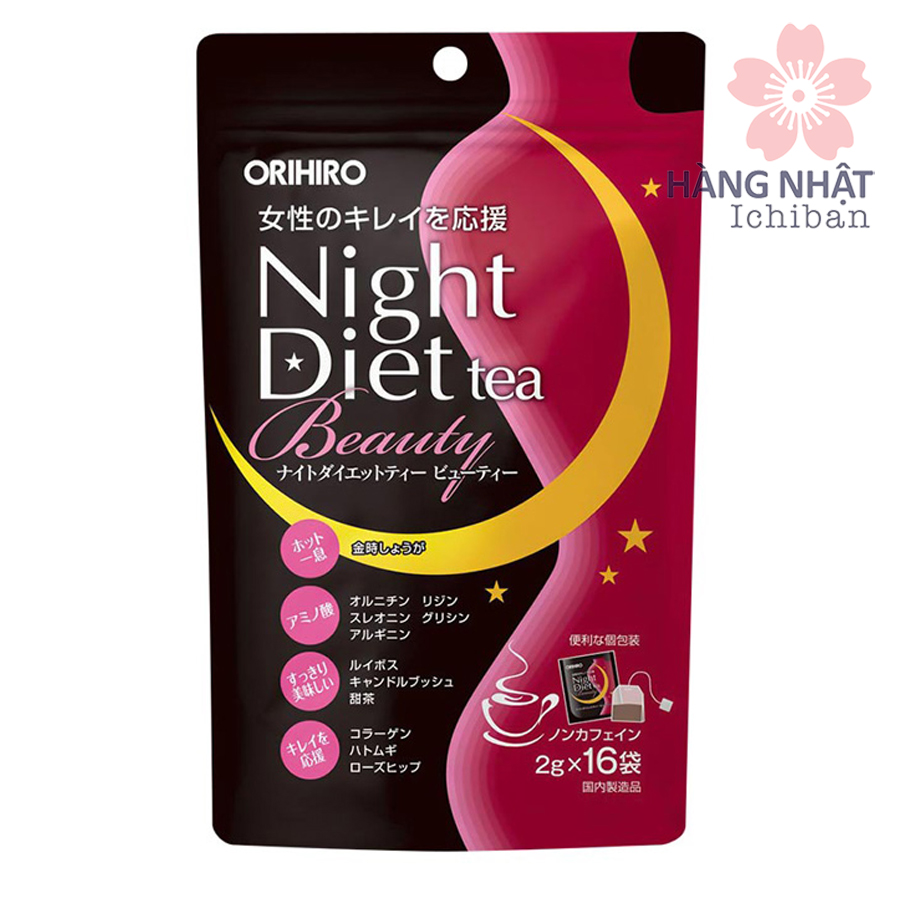 - Với thành phần từ các loại thảo dược như cỏ ngọt, muồng trâu, gừng, hoa cúc và collagen từ cá Orihiro Night Diet Tea Beauty sẽ giúp bạn giảm cân một cách tự nhiên.