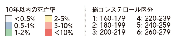 Tỷ lệ tử vong do bệnh động mạch vành tăng lên khi màu sắc chuyển từ xanh lam sang xanh lục rồi vàng sang đỏ. Đối với nam giới, sự thay đổi màu sắc cho thấy rõ rằng huyết áp càng cao và mức cholesterol càng cao thì nguy cơ mắc bệnh càng lớn. Ngược lại, đối với phụ nữ, sự thay đổi màu sắc diễn ra rất chậm; ngay cả khi mức cholesterol tăng cao thì màu sắc cũng ít thay đổi.